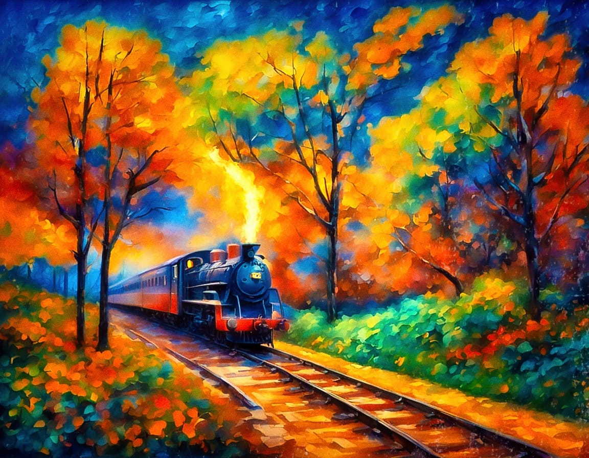 Fluierul locomotivei marchează începutul unei aventuri poetice. Aburul alb se ridică în aerul rece, iar razele de soare filtrează printre ramurile copacilor. Pe măsură ce trenul se mișcă, frunzele dansează în vârtejuri, celebrând efemerul anotimpului. Sunetul metalic al roților devine parte din simfonia naturii – o combinație de nostalgie, ritm și culoare.