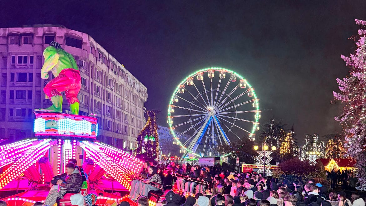 Copiii aleargă entuziasmați către satul Moșului, iar adulții se lasă cuceriți de gustul vinului fiert, de bucuria mâncărurilor tradiționale și de micile bucurii ascunse la fiecare stand. Totul pulsează de viață: roata panoramică, luminițele reflectate pe clădiri, zâmbetele oamenilor care se bucură fără grabă.